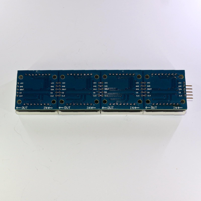 4 Way MAX7219 dot matrix moving message display module for arduino and esp8266 not included. These modules can be used to construct a moving message display. They can be cascaded together to make longer displays. I have a library that can be used with this module as the MaxMatrix library is unable to rotate the display. These modules have the advantage in that you can create a moving message display without all the messy wiring between modules.
