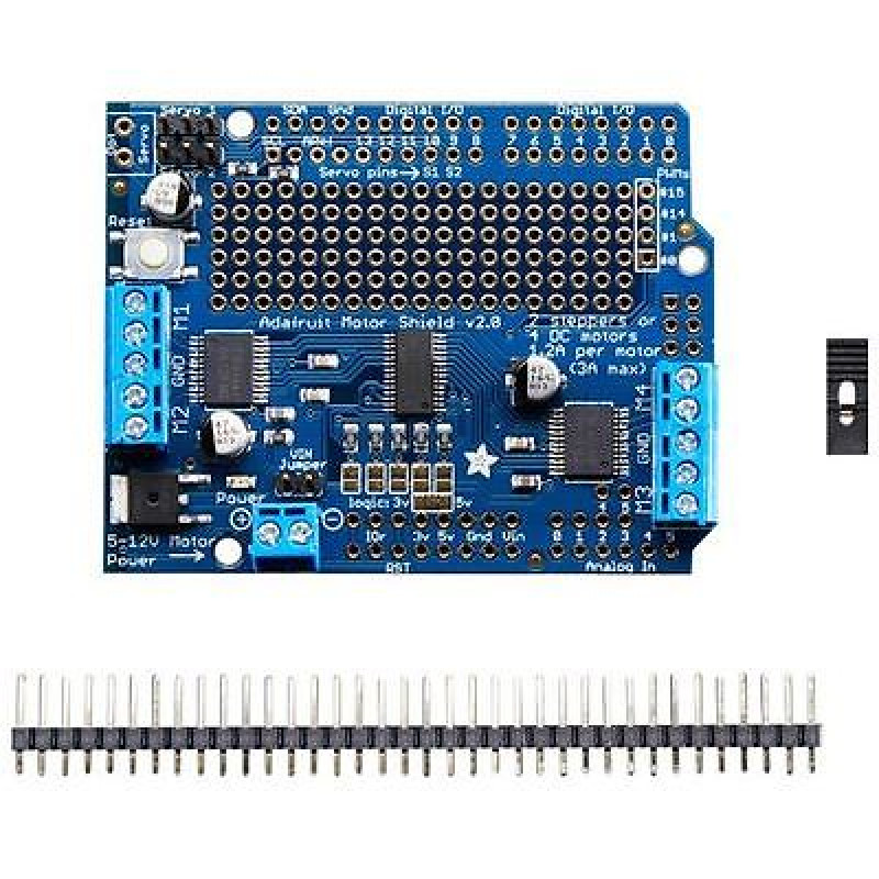 Comes with an assembled & tested shield, terminal block, plain header, jumper. Some soldering is required to assemble the headers on. Stacking headers not included, but we sell them in the shop so if you want to stack shields, please pick them up at the same time.Arduino and motors are not included but we have lots of motors in the shop and all our hobby servos, DC motors, and stepper motors work great.