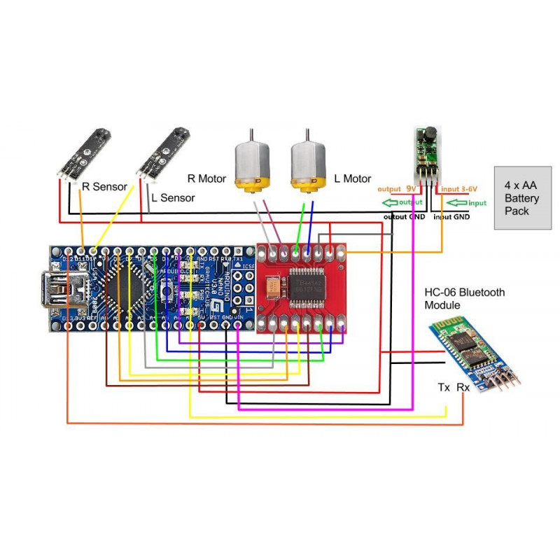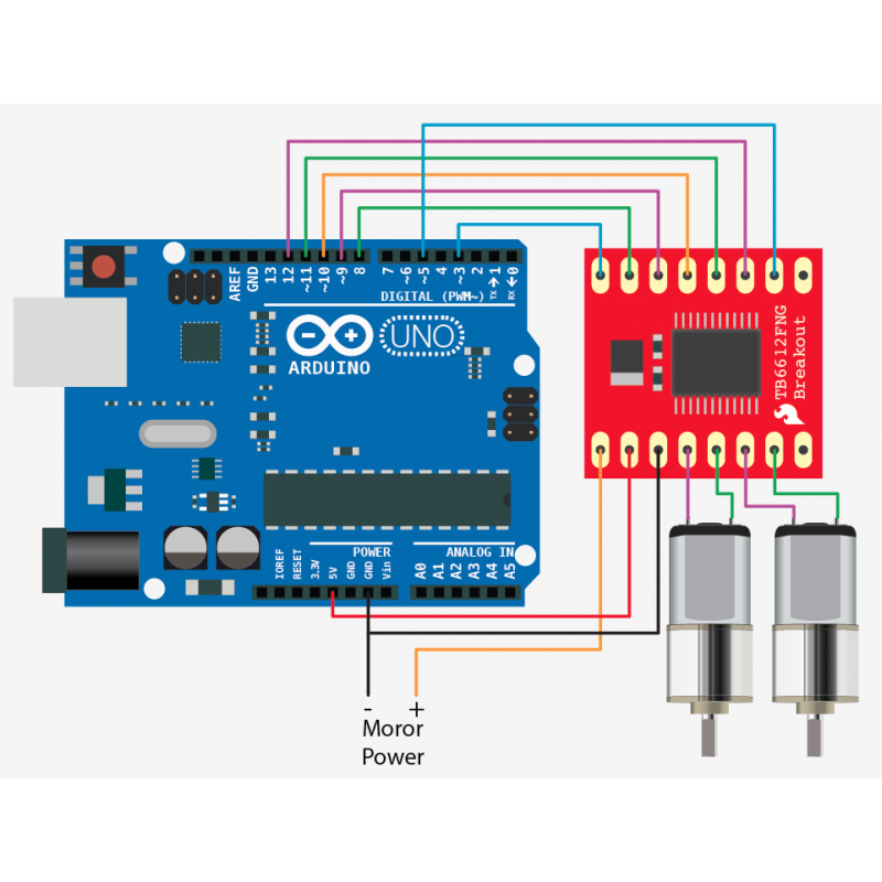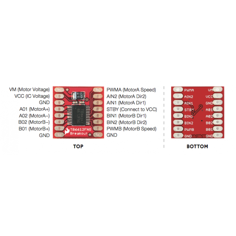 Motordriveren TB6612FNG har to H-broer, kan styre opp til to likstrøms motorer med en konstant strøm på 1,2A (3,2A topp). To inngangssignaler (IN1 og IN2) kan brukes til å styre motoren i en av fire mulige moduser: CW (sving med urviseren), CCW (moturs), kortbrems og stopp. De to motorutgangene (A og B) kan styres separat, Hastigheten til hver motor styres av et PWM-signal med en frekvens på opptil 100 kHz. STBY-knappen når den er satt til HIGH, plasserer motoren i standby-modus. Føreren har interne beskyttelsesdioder.