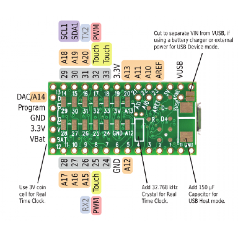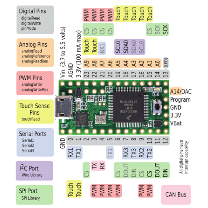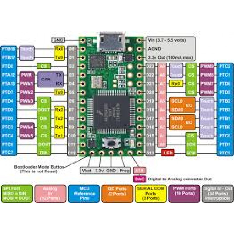 The Teensy is a breadboard-friendly development board with loads of features in a, well, teensy package. The Teensy LC (Low Cost) is a 32 bit microcontroller board that provides you with an uncomplicated option for getting started with the Teensy line of products without breaking the bank! The Teensy LC comes pre-flashed with a bootloader so you can program it using the on-board USB connection: No external programmer needed! You can program for the Teensy in your favorite program editor using C or you can install the Teensyduino add-on for the Arduino IDE and write Arduino sketches for Teensy! The processor on the Teensy also has access to the USB and can emulate any kind of USB device you need it to be, making it great for USB-MIDI and other HID projects. The 32 bit processor brings a few other features to the table as well, such as multiple channels of Direct Memory Access and an I2S digital audio interface! There are also 2 separate interval timers! Also, the Teensy LC can provide system voltage of 3.3V or 5V to other devices at up to 5-20mA. All of this functionality is jammed into a 1.4 x 0.7 inch board with all headers on a 0.1" grid so you can slap it on a breadboard and get to work! So, what sets the Teensy LC apart from the Teensy 3.1? First off, this version has been streamlined to be as cost effective as possible. Obviously, the LC doesn’t share a lot of power that the 3.1 possesses but by no means does it make the LC a ‘weak’ board! The Teensy LC is equipped with 8kb RAM, 62kb of flash memory, and 27 Digital I/O pins with 13 high res Analog inputs. Note: The Teensy LC does not come with a USB cable, please check the Recommended Products section below for an appropriate one. Dimensions: 1.4 x 0.7" (~35 x 18 mm) Features: